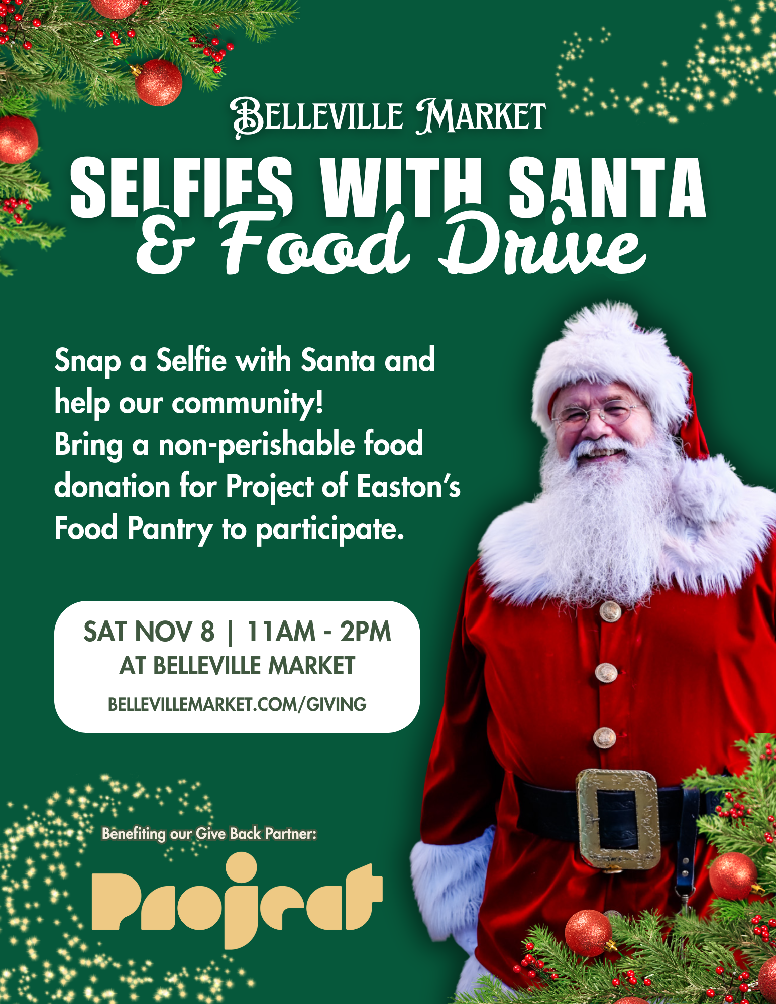 To kick off this season of giving, join us for Selfies with Santa & our Neighborhood Food Drive on Saturday, November 8 from 10AM–1PM at Belleville Market in Downtown East!